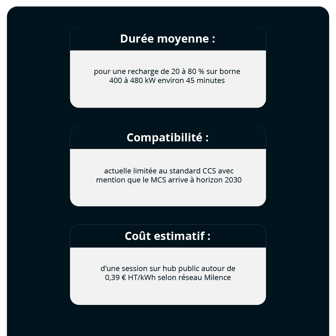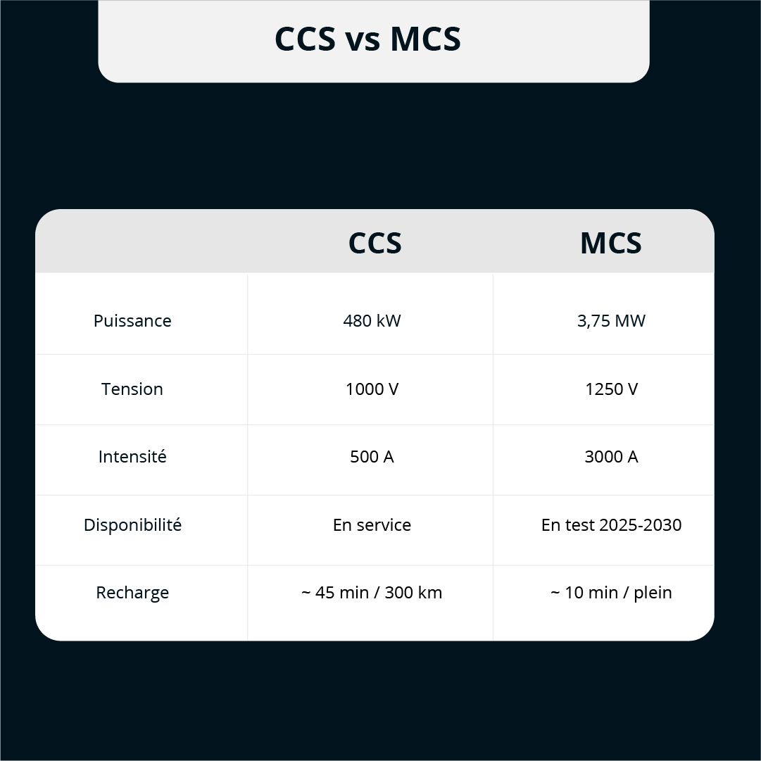 Le standard MCS viendra aussi renforcer ce réseau. Avec des puissances proches du mégawatt, il permettra une recharge complète en moins de quelques minutes. Le temps d’un café et d’un contrôle de chargement.